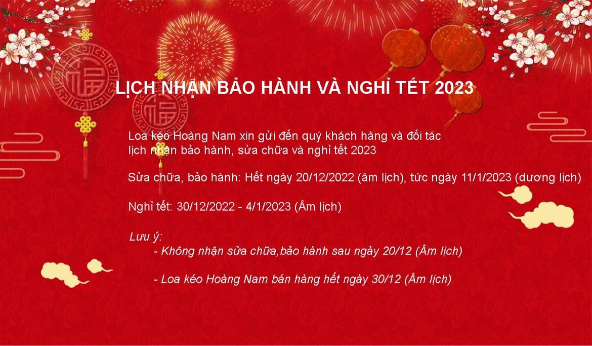 Hòa chung niềm vui năm mới, Loa Kéo Hoàng Nam cũng xin trân trọng thông báo lịch nghỉ Tết Nguyên Đán cũng như lịch nhận bảo hành như sau: