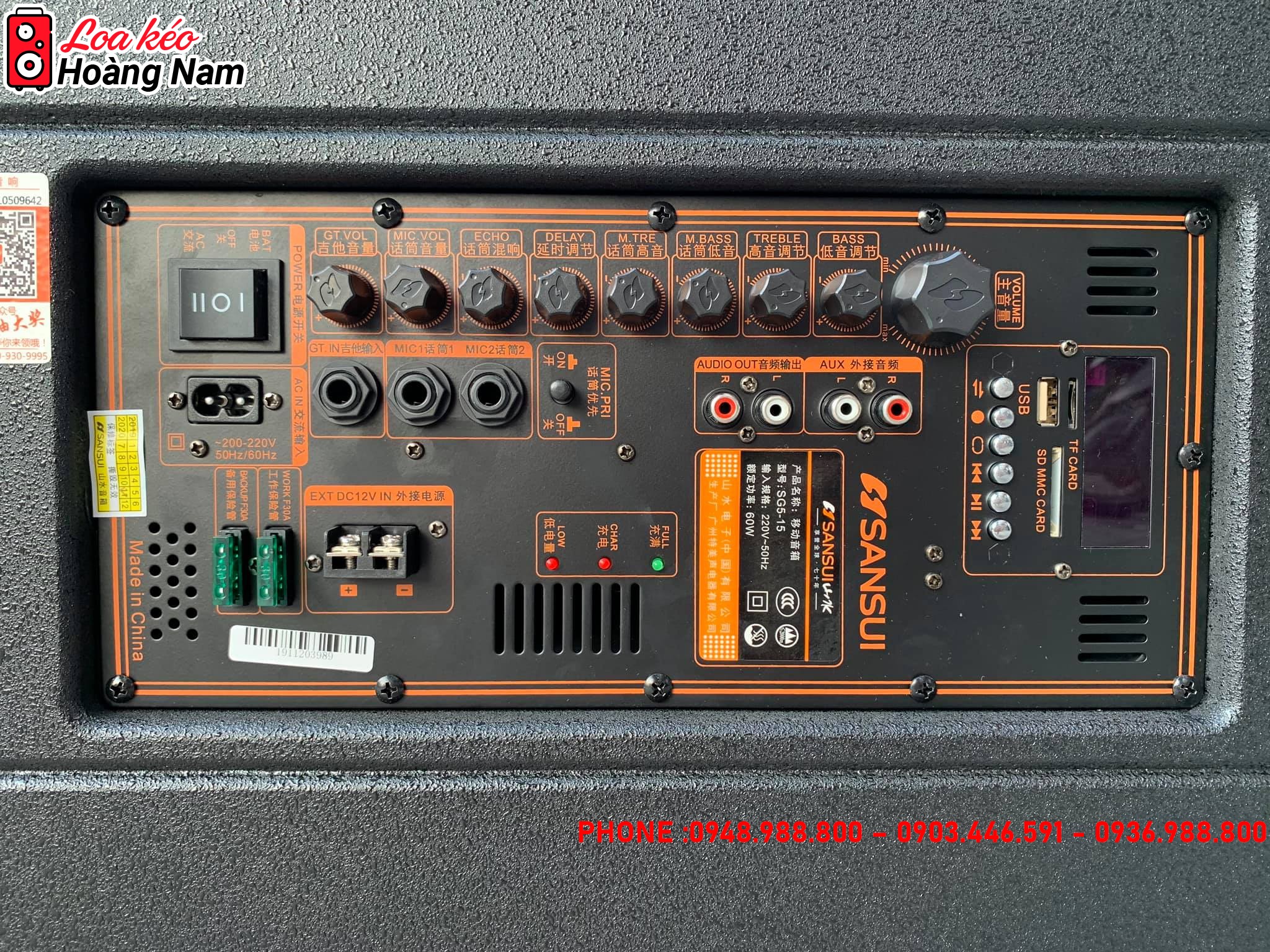 Bảng điều khiển của loa kéo Sansui SG5-15 được lắp ở mạn phải của loa, khá nhỏ gọn. Với các nút điều khiển khá đơn giản, bao gồm: Music Vol, Bass, Treble, Deley, Echo, M.Bass, M.Treble, Mic Vol và Guitar Vol.. Loa bao gồm 2 lỗ cắm mic và 1 lỗ cắm Guitar.