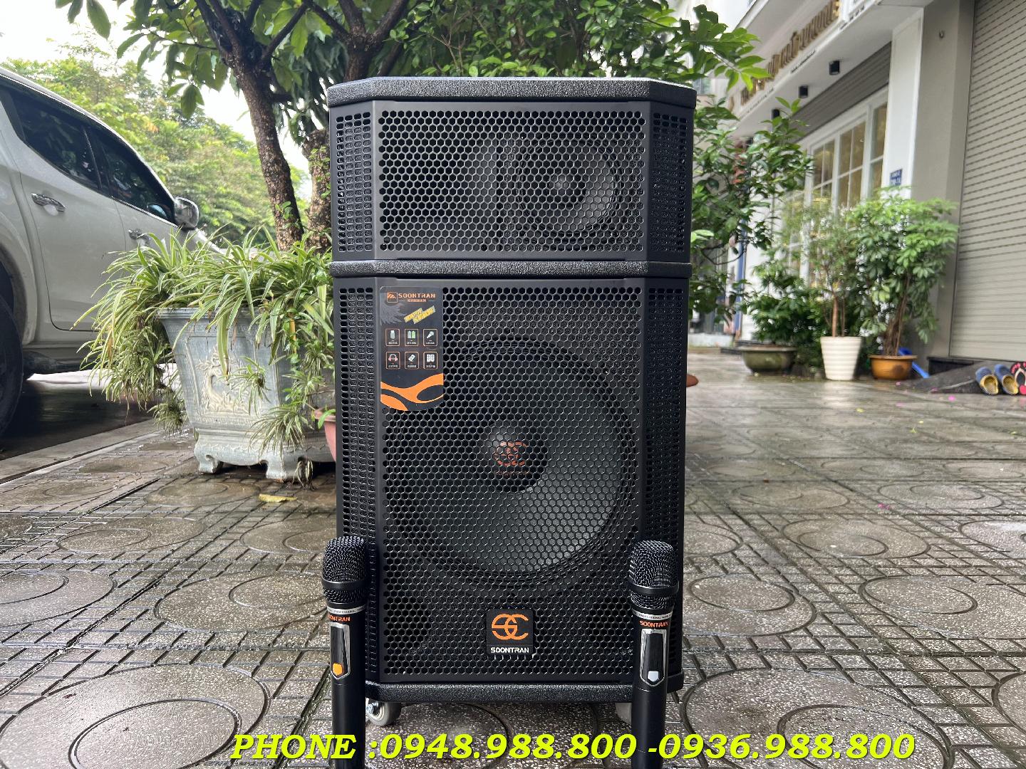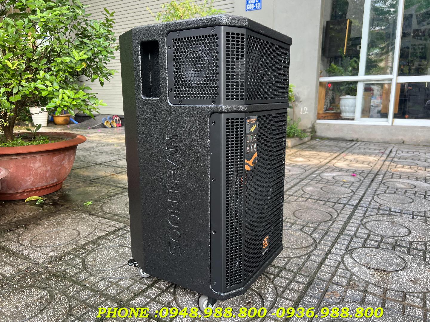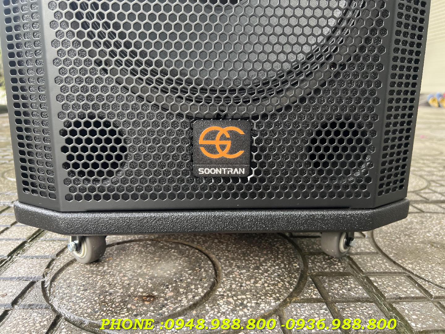Logo thương hiệu Soontran được thiết kế ở mặt lướt thùng loa gỗ tạo điểm nhấn tên thương hiệu. Kích thước các chiều rộng, cao, sâu của loa đạt 400 x 700 x 380 mm với trọng lượng 32 kg không gây quá nhiều khó khăn cho người dùng khi kéo theo loa tới bất kỳ đâu.