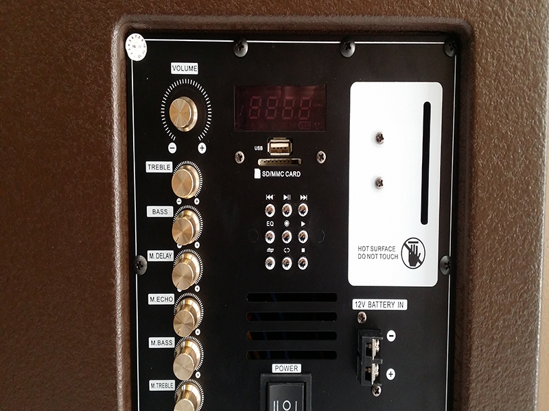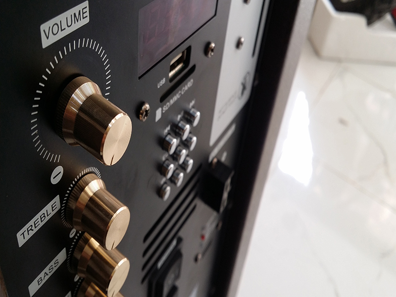 Sở hữu 1 vỉ điều khiển cao cấp, ta có thể thấy một bảng đèn led, cho phép người dùng theo dõi mọi hoạt động của loa, kèm theo đó là các nút chỉnh xung quang khi dùng ở chế độ USB, nút chỉnh mode cho phép chúng ta có thể chuyển sang chế độ Bluetooth hoặc nhe đài FM 1 cách dễ dàng nhất và cổng USB, SD thông thường.