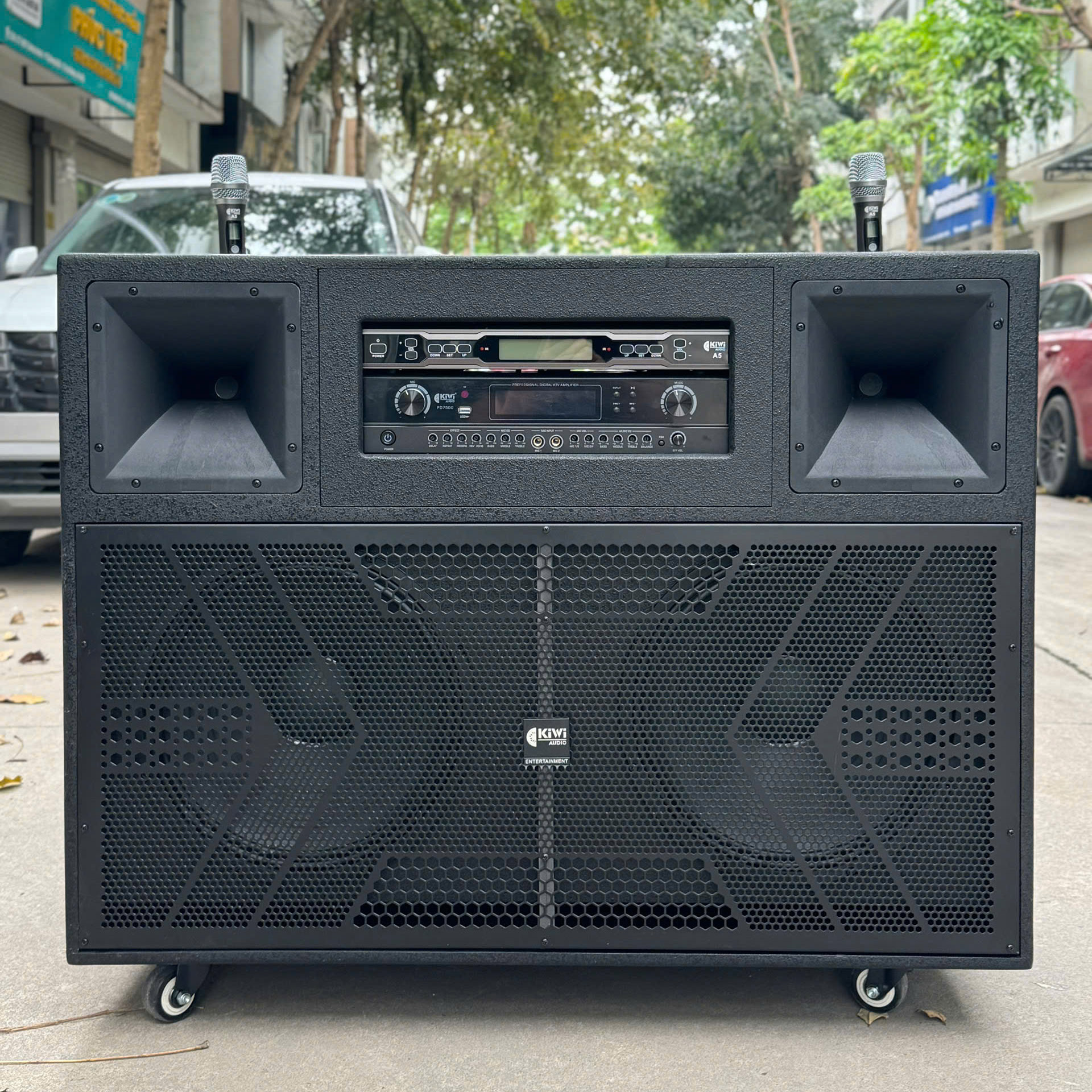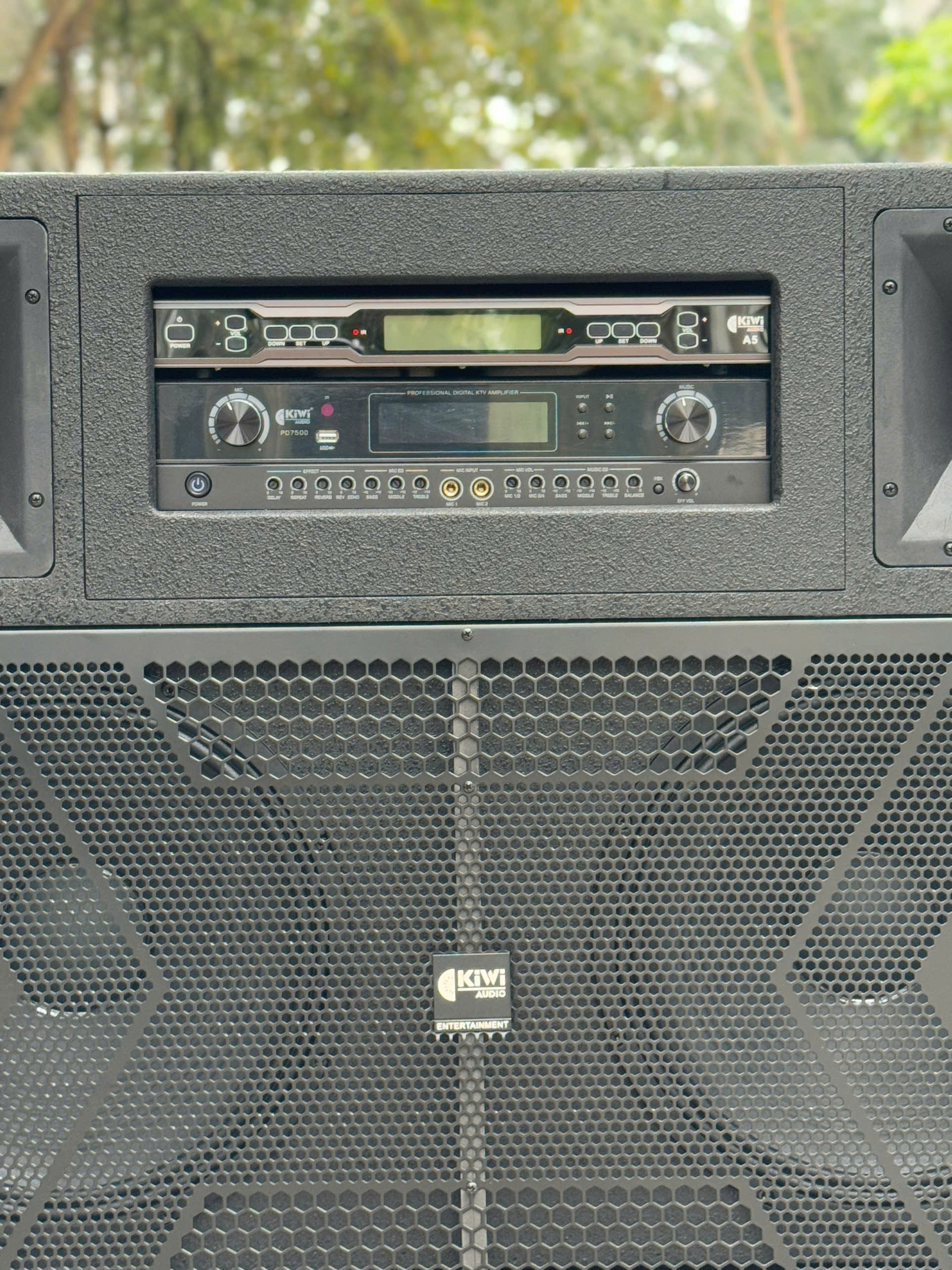 Sở hữu công suất lên tới 1200W, hệ thống loa gồm 2 bass 40cm, 2 loa treble sẽ đem lại chất âm đúng theo ý muốn của các quý khách. Bên cạnh đó tiếng mic và vang hòa quyện với nhau tạo ra chất âm mượt mà, tiếng micro nhẹ nhàng, bay bổng sẽ đem lại sự trải nghiệm karaoke cực kỳ tuyệt vời cho những quý vị đam mê ca hát.
