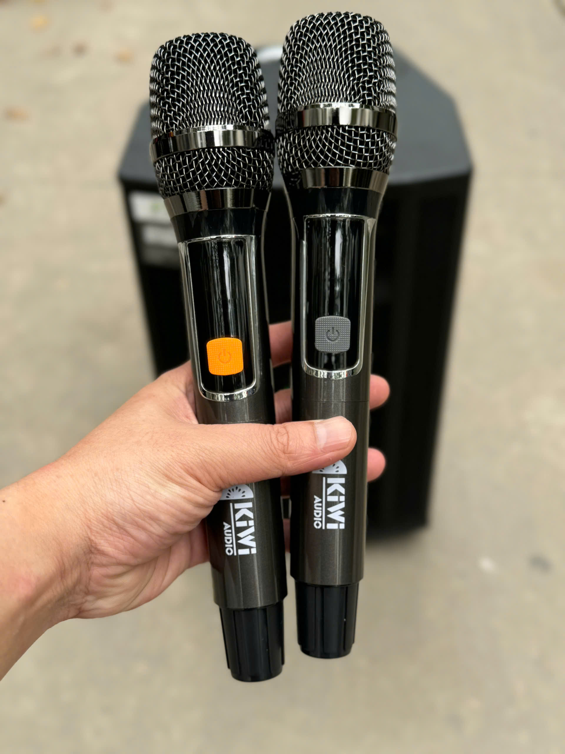 Đi kèm theo loa là 2 micro không dây UHF, độ nhạy cao, khả năng bắt sóng xa và ổn định, hỗ trợ bạn thoải mái thể hiện giọng ca.
