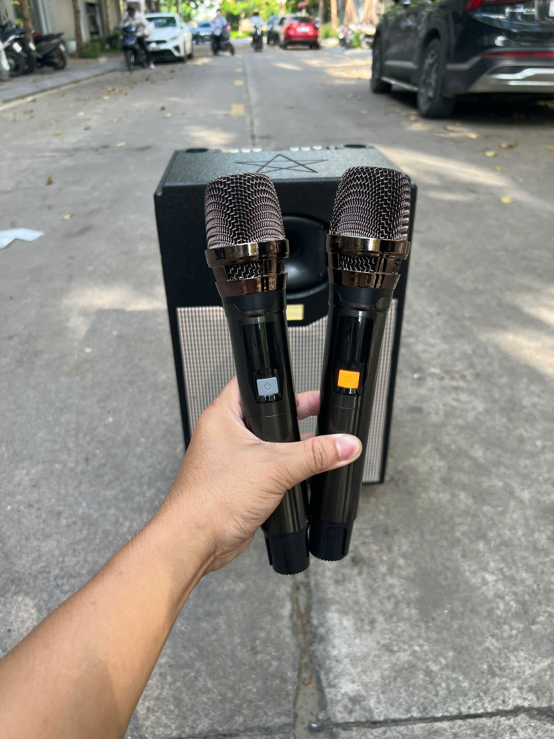 Đi kèm là cặp micro không dây cho tiếng mic bay bổng, hát nhẹ nhàng, bắt tiếng.