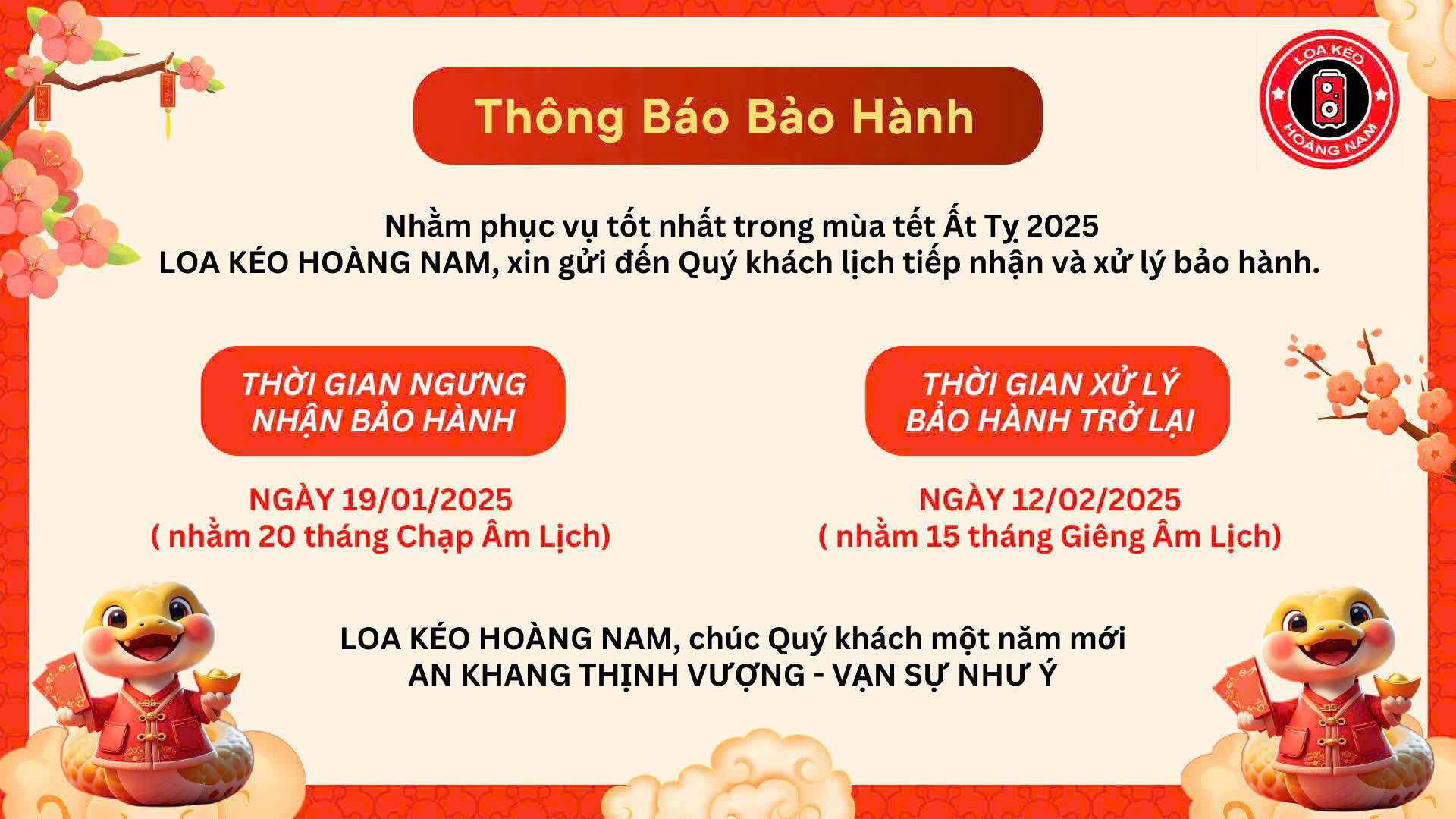Hòa chung niềm vui năm mới, Loa Kéo Hoàng Nam cũng xin trân trọng thông báo lịch nghỉ Tết Nguyên Đán cũng như lịch nhận bảo hành như sau: